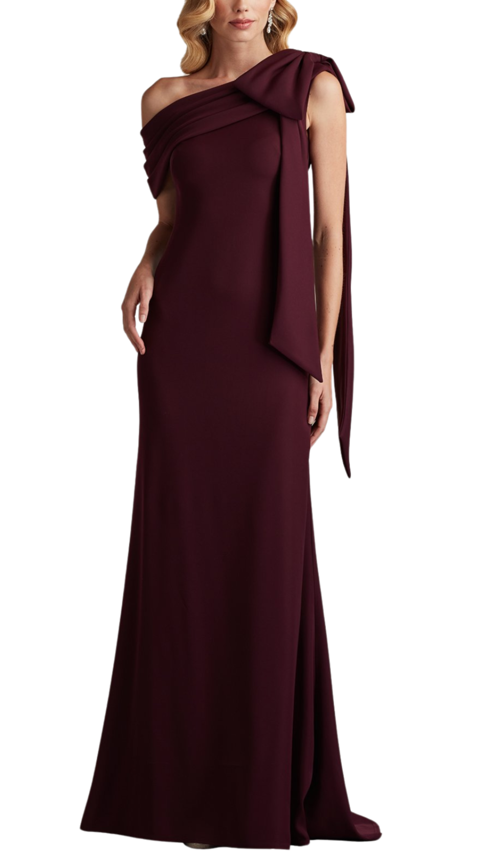 Tadashi Shoji Cassia Bow-Shoulder Crepe Gown in Blackberry