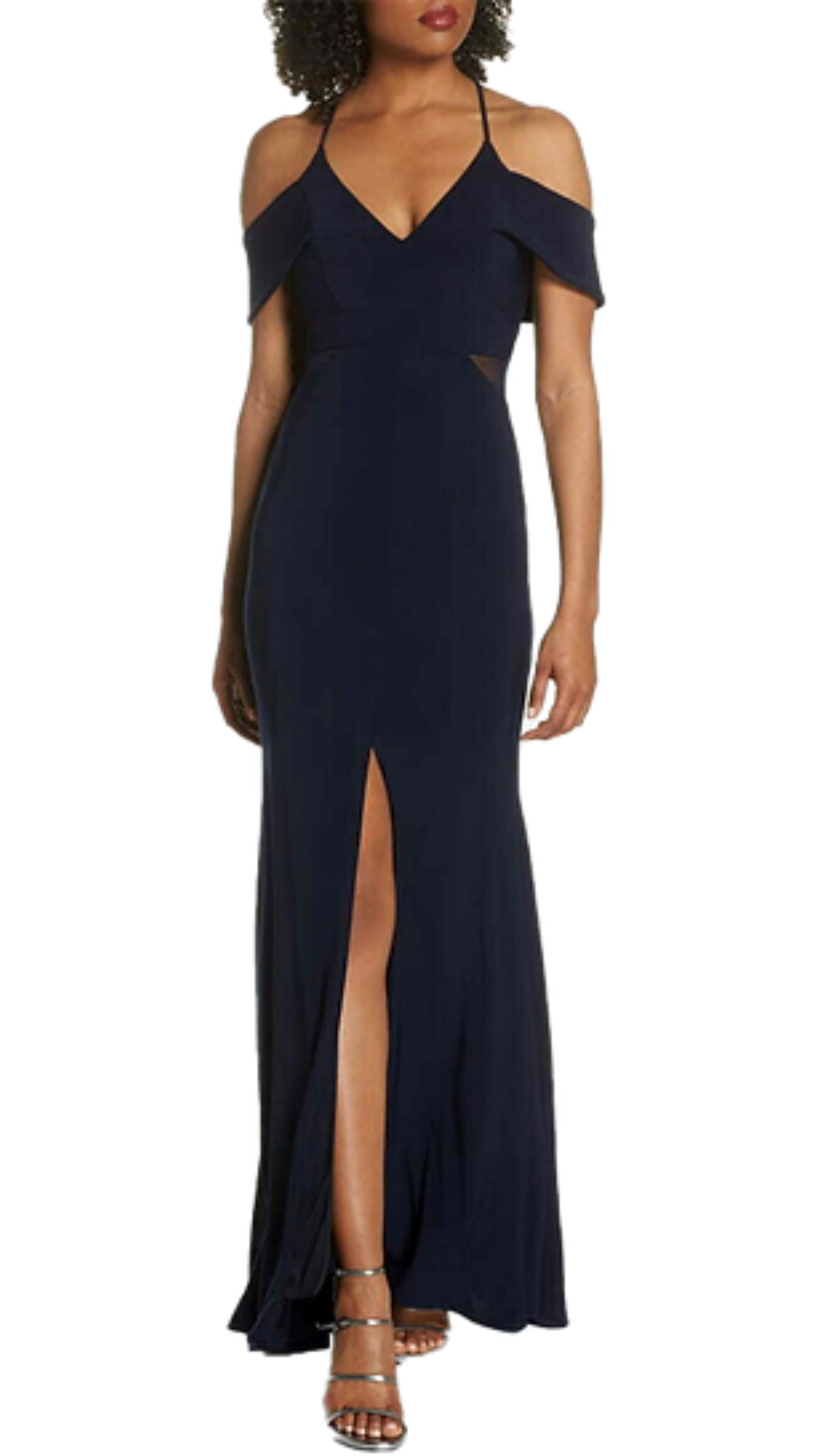 Excape Selena Off-Shoulder Slit Gown in Navy