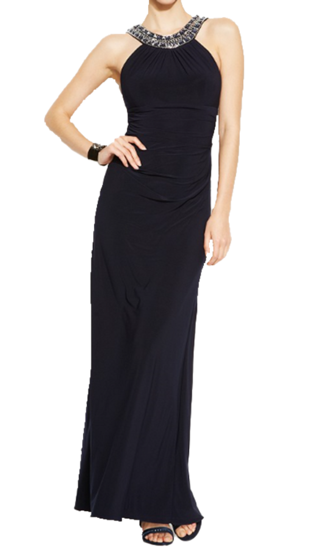 Shelli Segal Sydney Bead-Trim Ruched Halter Gown in Navy