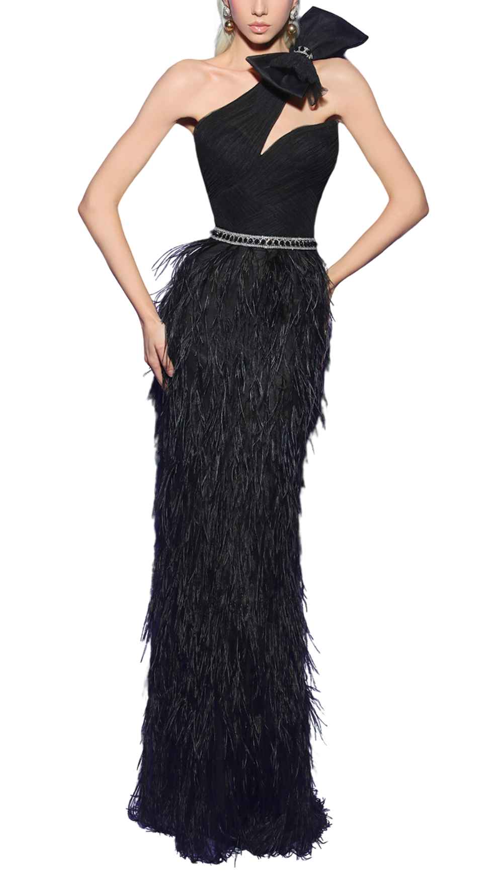 Tarik Ediz Jesse Feather One Shoulder Gown in Black